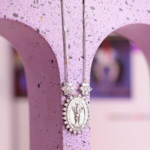 Colar Veneziana Banhado à Ródio Branco com Flor Cravejada e Medalha de São Miguel