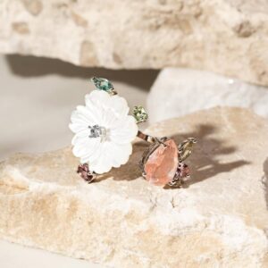Anel Fusion Morganita Madrepérola Cristal Ametista Verde e Arranjo de Flor