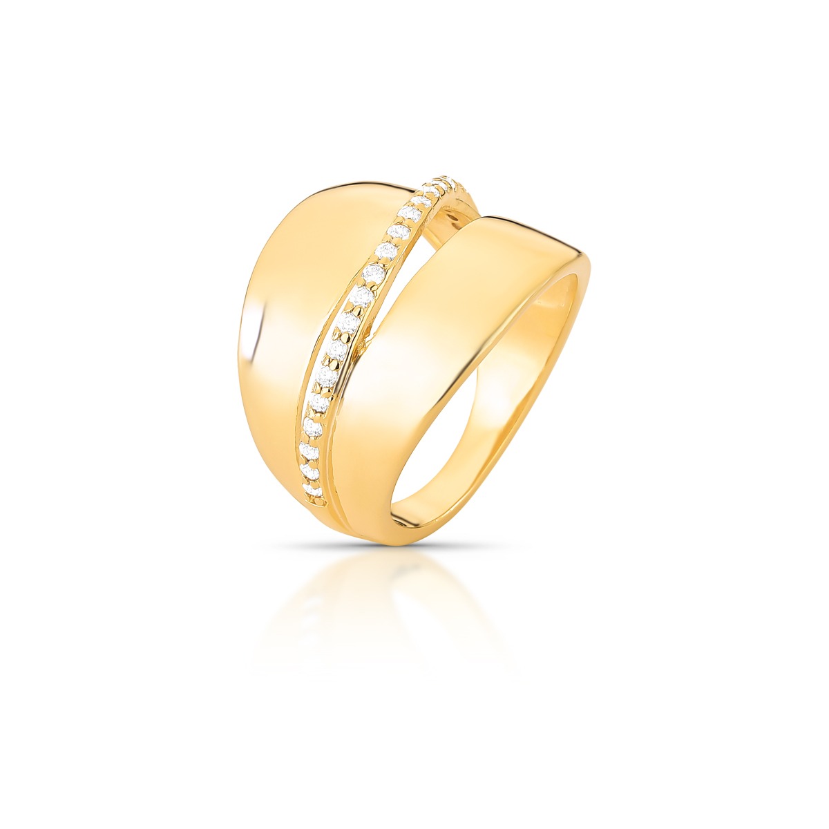Anel Banhado à Ouro 18K Linhas Curvas Vazadas Filete Cravejado.