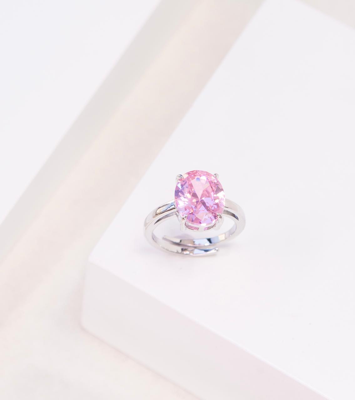 Anel Oval Regulável Banhado à Ródio Branco com Pedra Kunzita