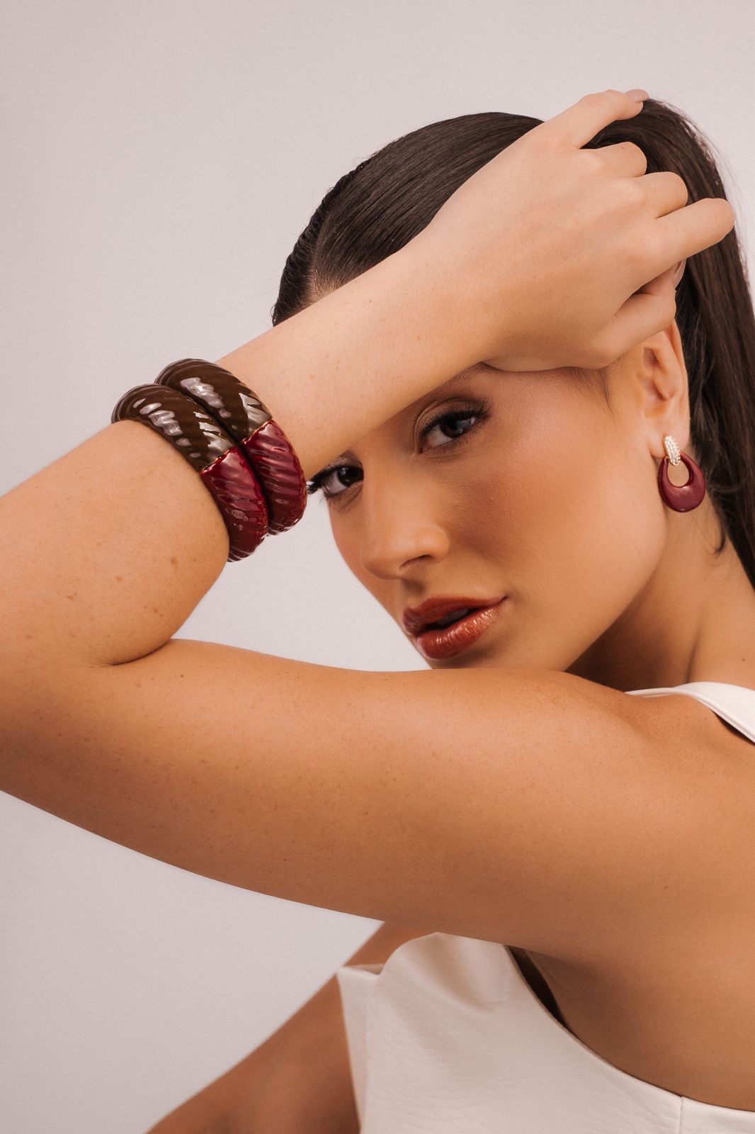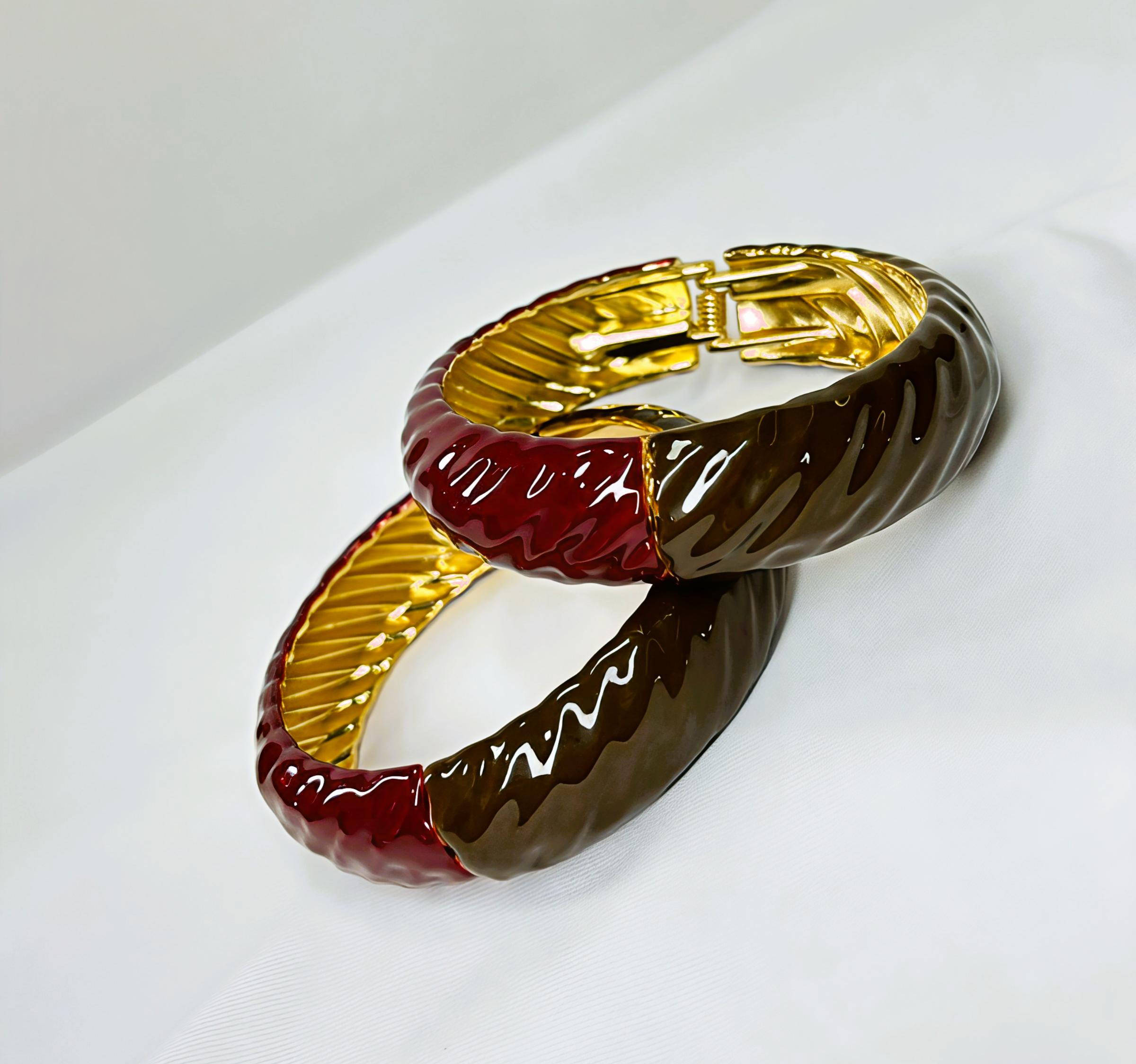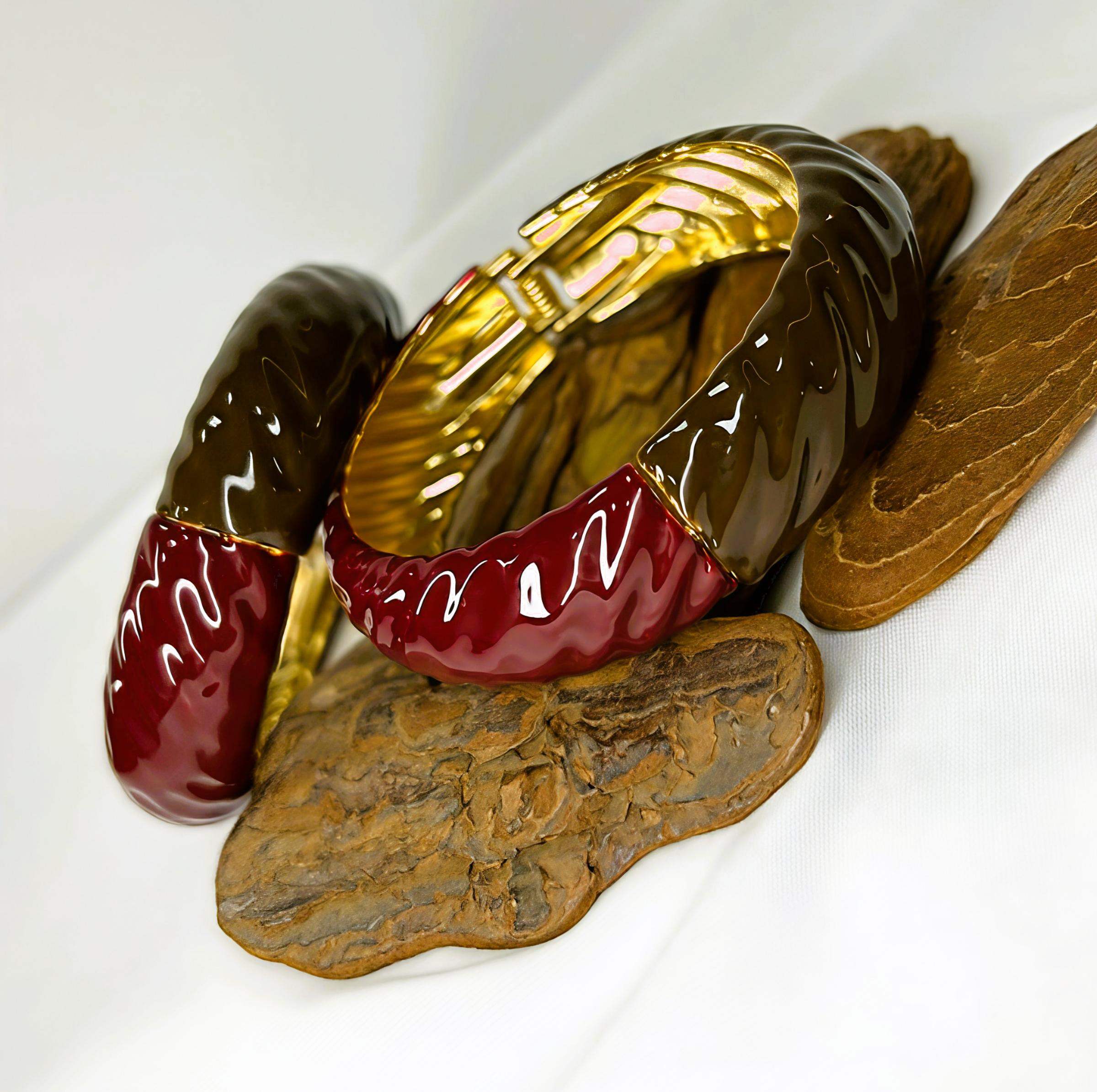 Bracelete Esmaltado Largos Bordô/Marrom Banhado à Ouro 18k Luxuoso