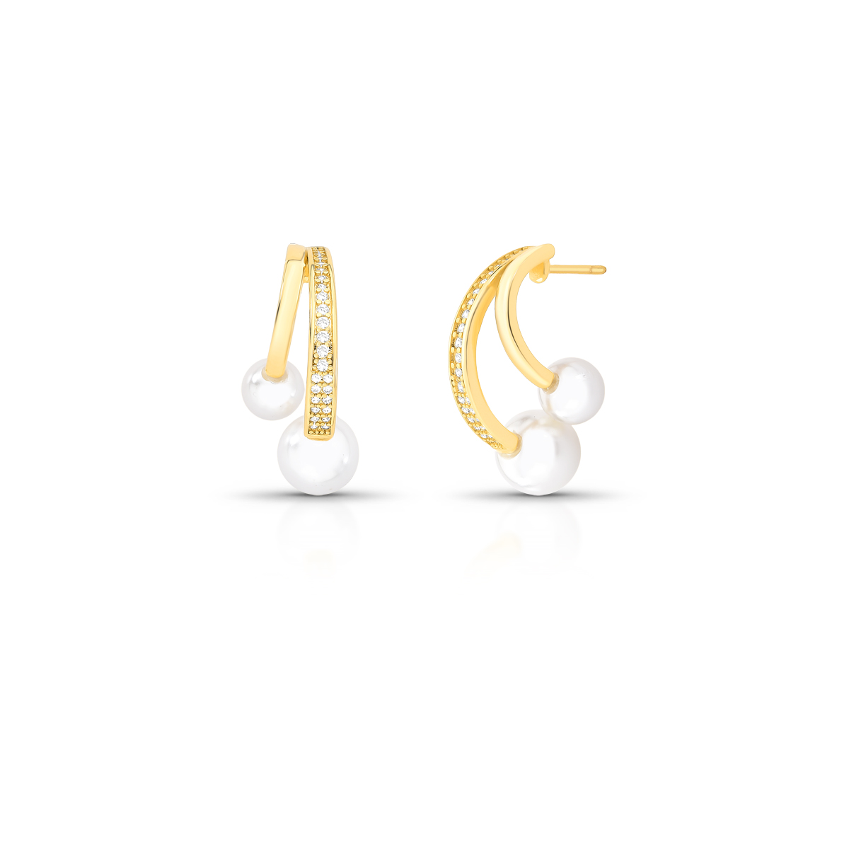 Brinco Banhado à Ouro 18K Cravejado com Zircônia e Duas Pérolas Shell