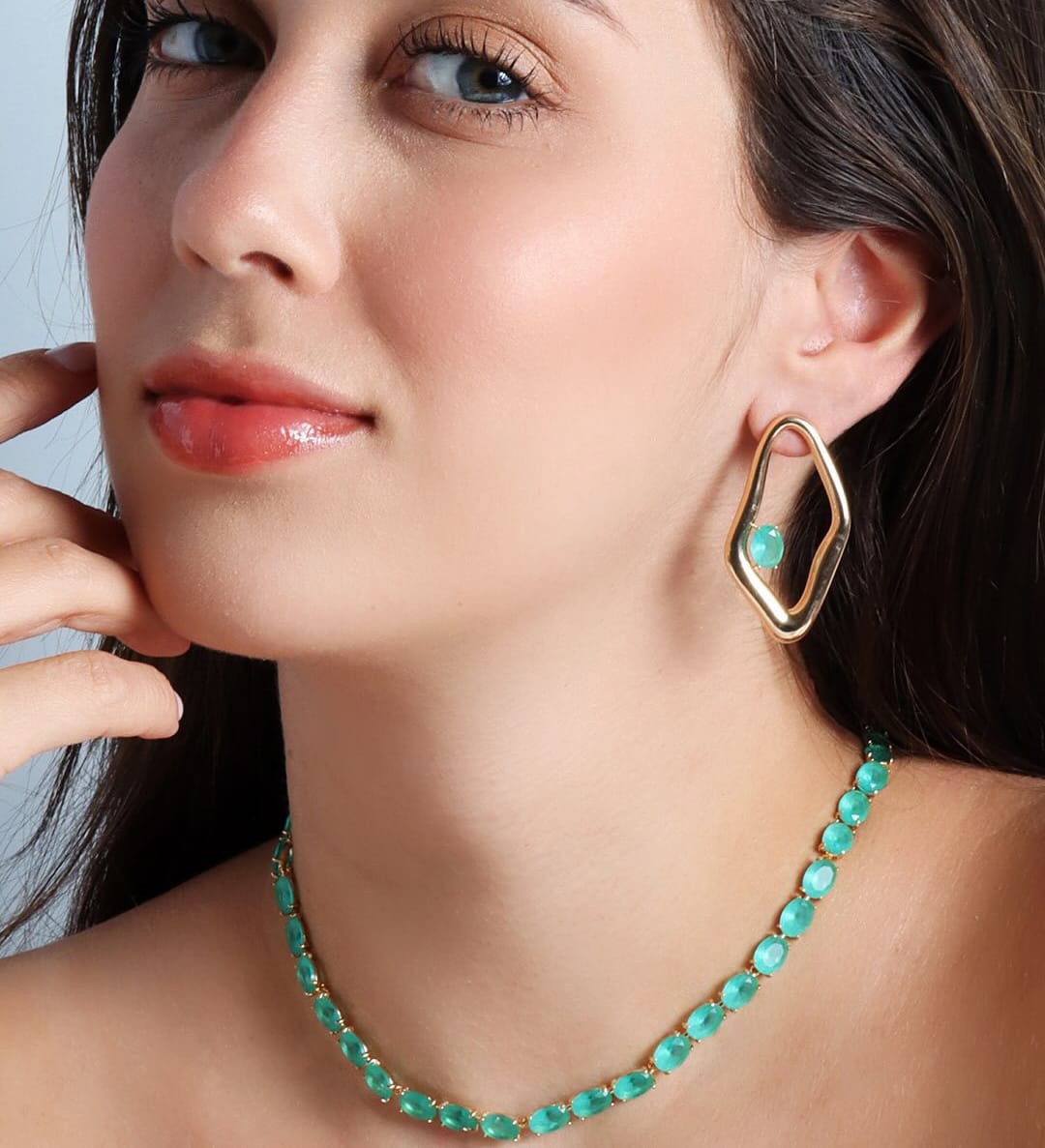 Brinco Banhado à Ouro 18K Vazado com Pedra de Cristal Verde