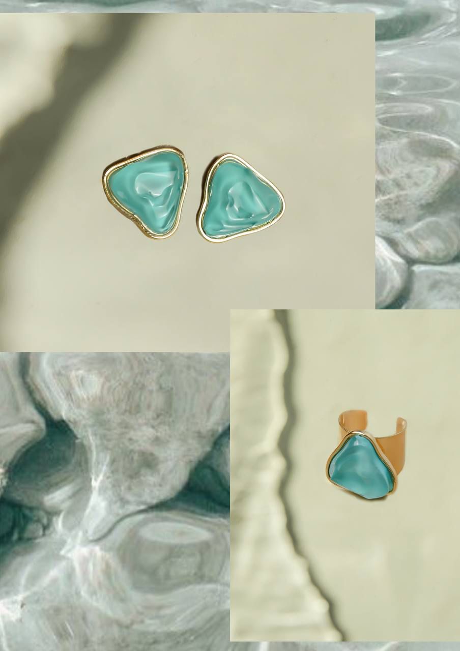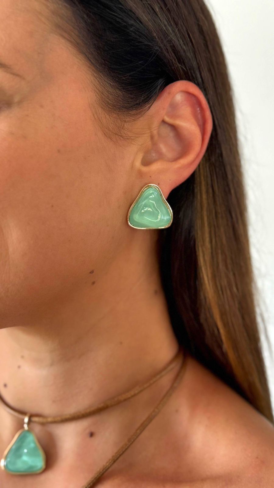 Brinco emoldurado em ouro 18K com pedra verde translúcida triangular.