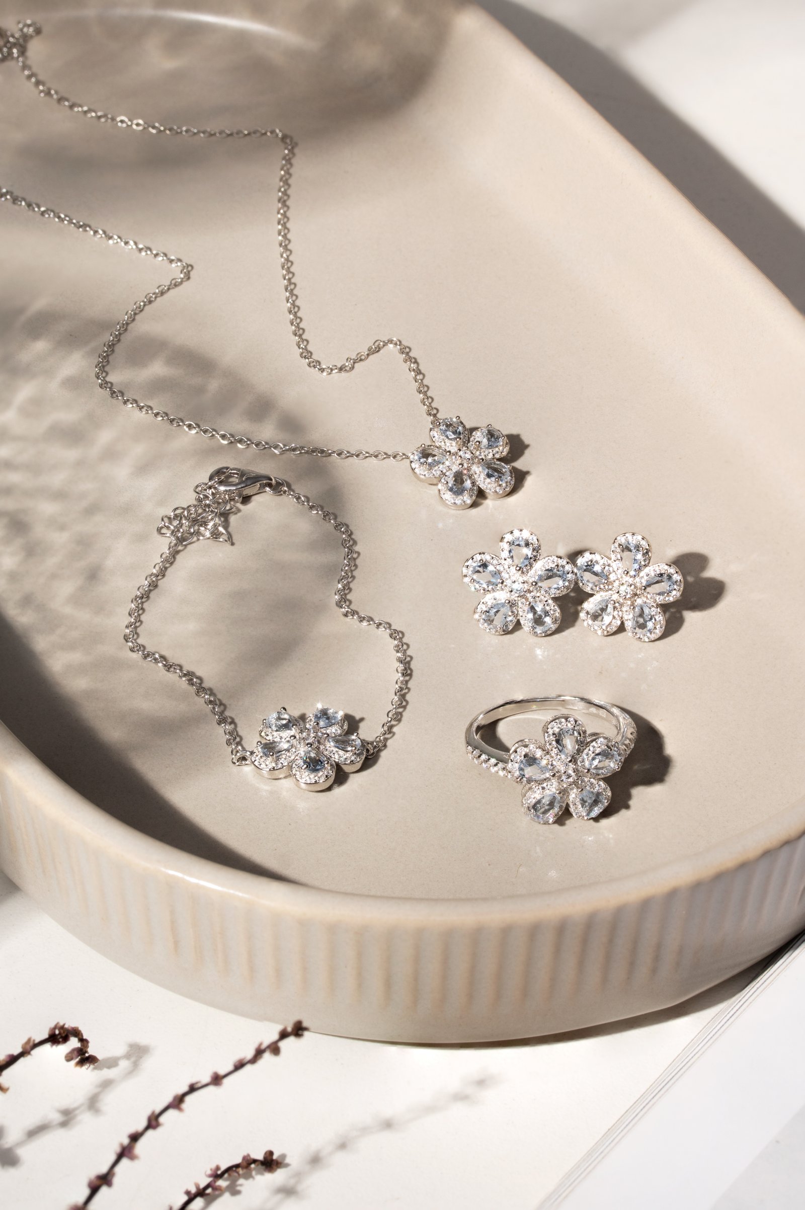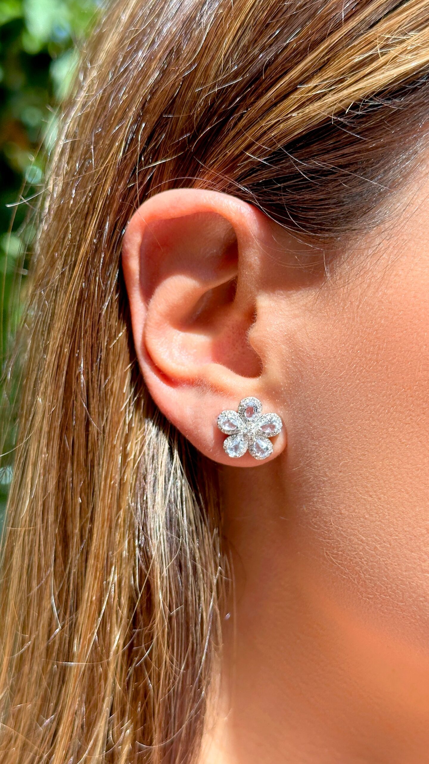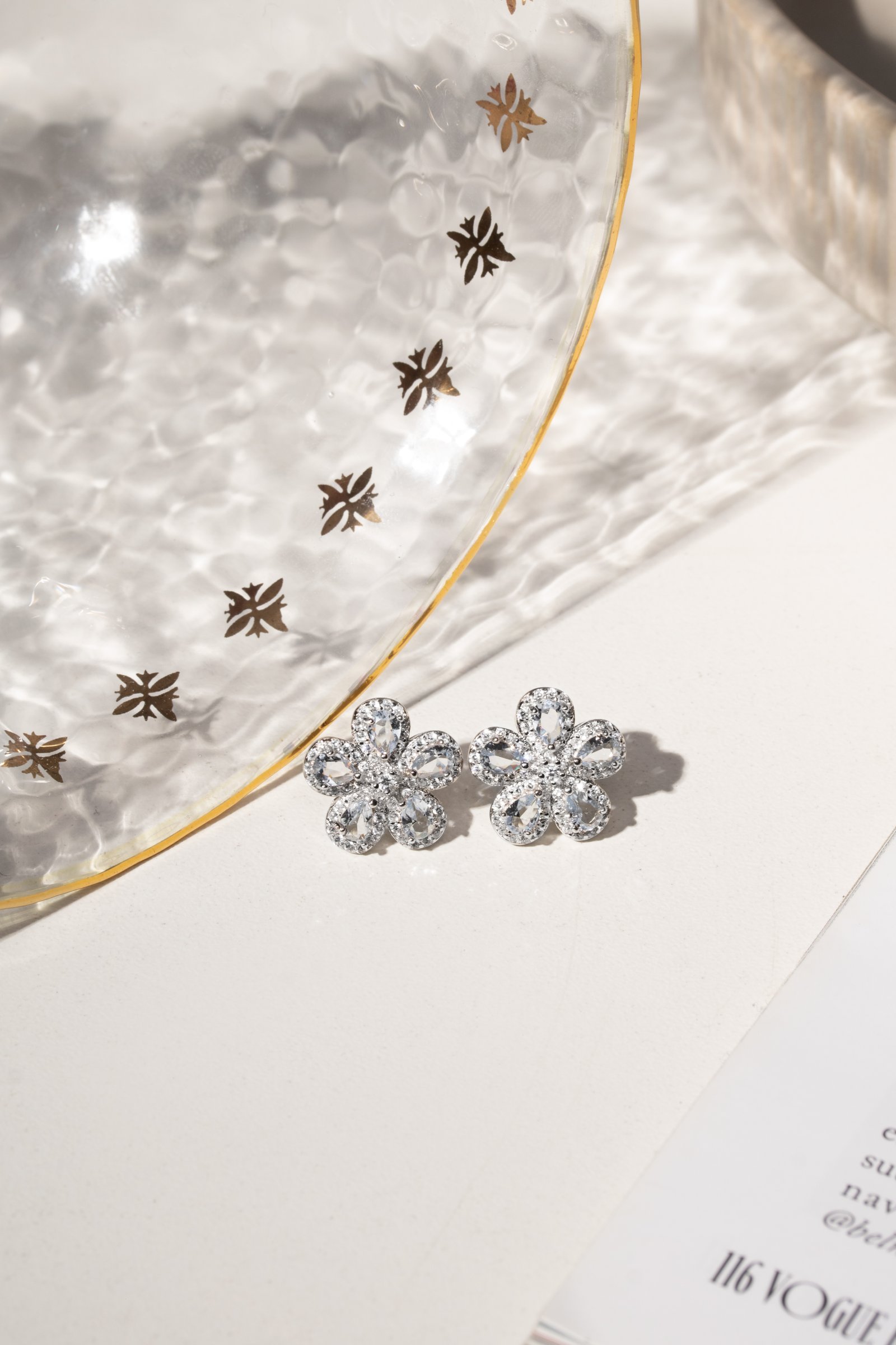 Brinco Flor 5 Pétalas Banhado à Ródio Branco Cravejado com Zircônia e Cristal London Blue