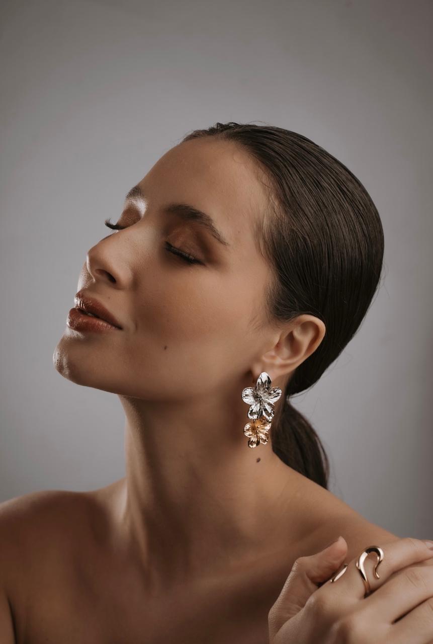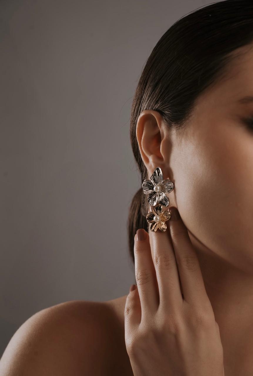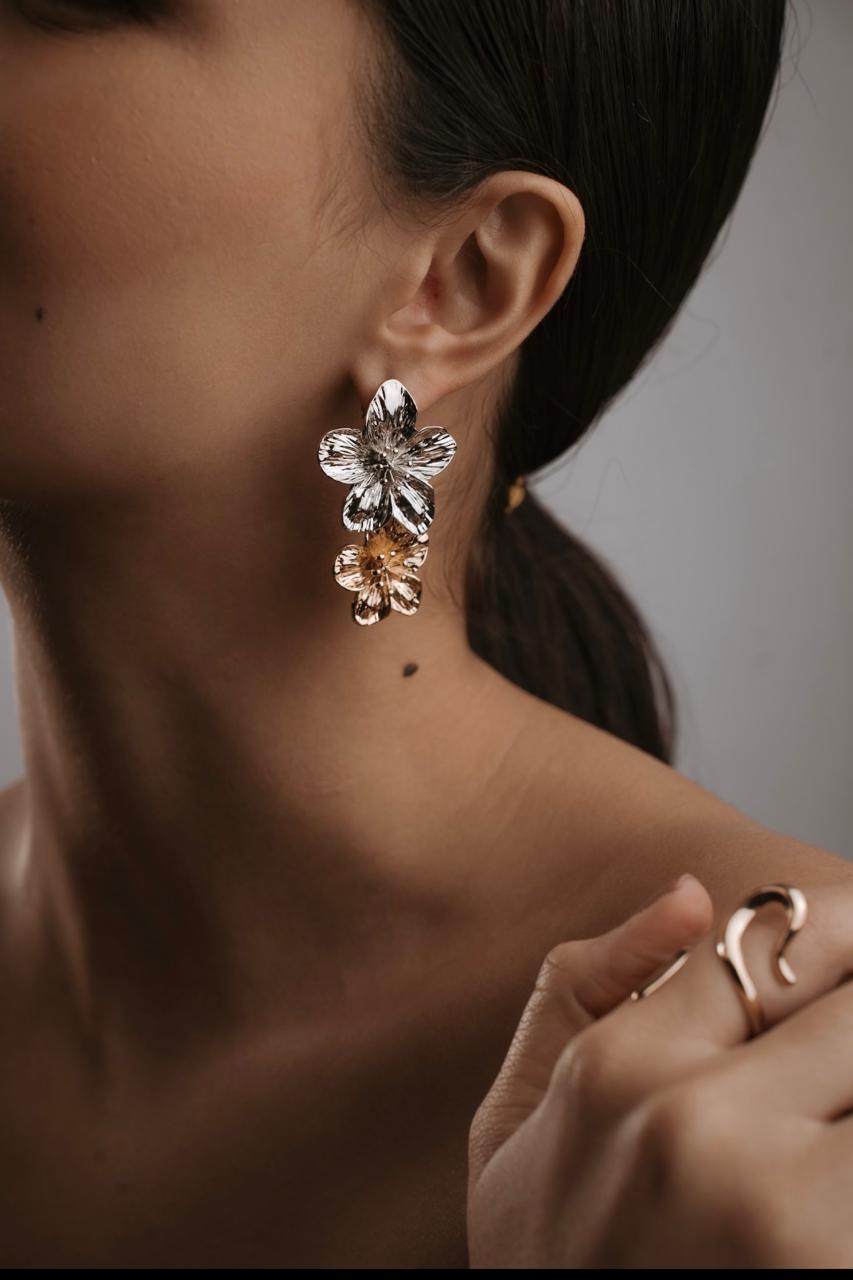 Brinco Flor Dupla Banhado à Ouro 18k e à Ródio Branco