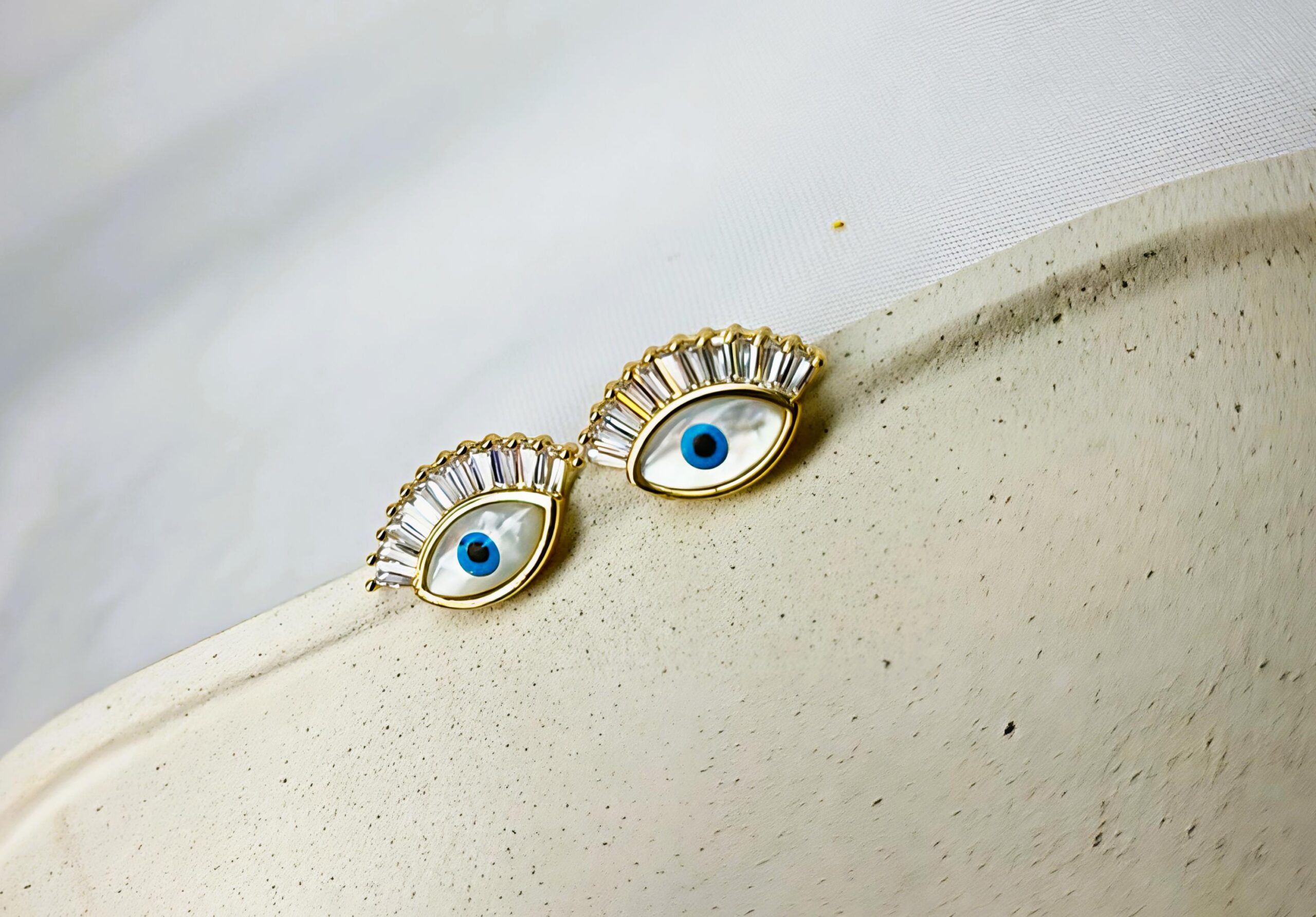 Brinco Olho Grego com Baquete Banhado á Ouro 18k e Madre Pérola