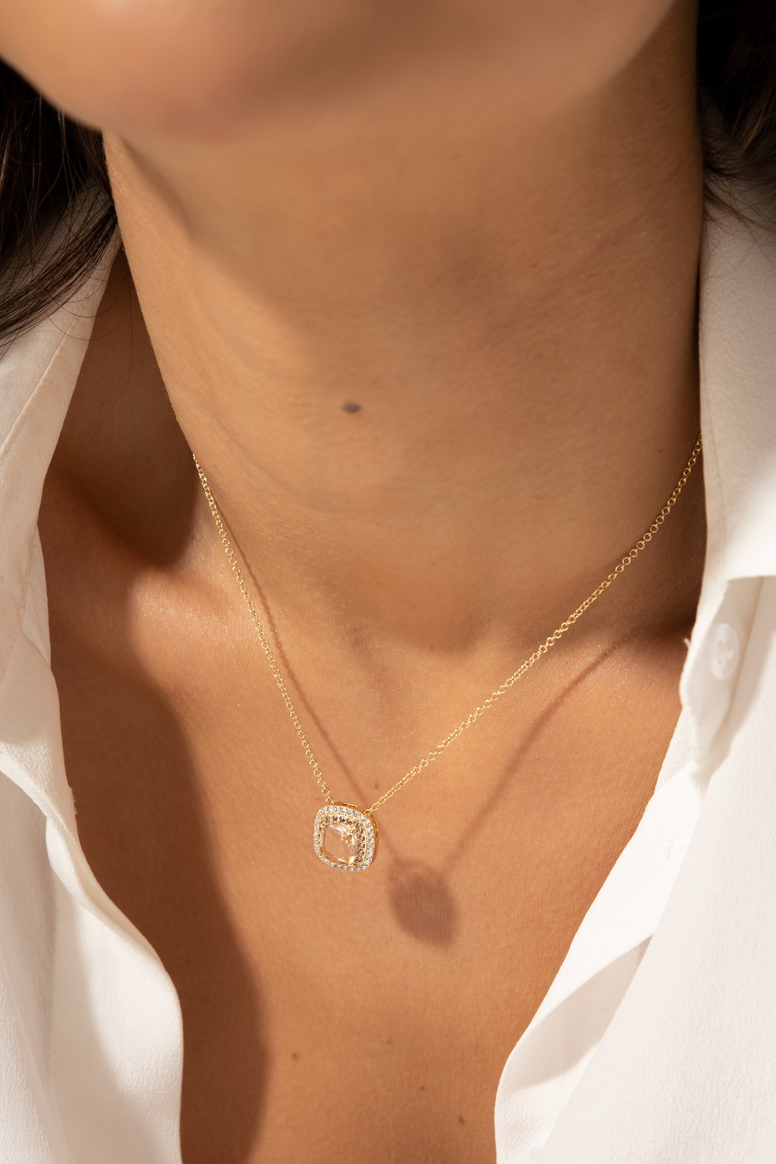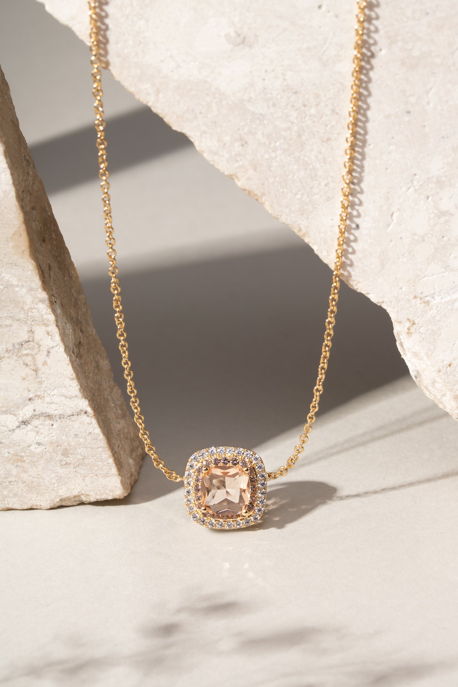 Colar Banhado à Ouro 18k com Cristal Morganita Quadrado Cravejado com Zircônia Branca