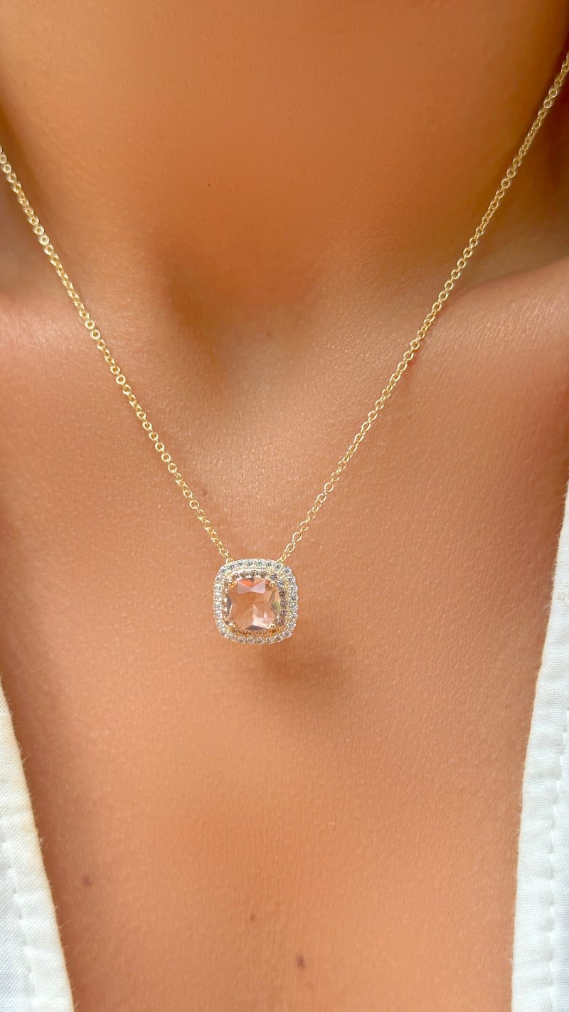 Colar Banhado à Ouro 18K Cristal Morganita Quadrado Bege/Rose e Zircônia Branca