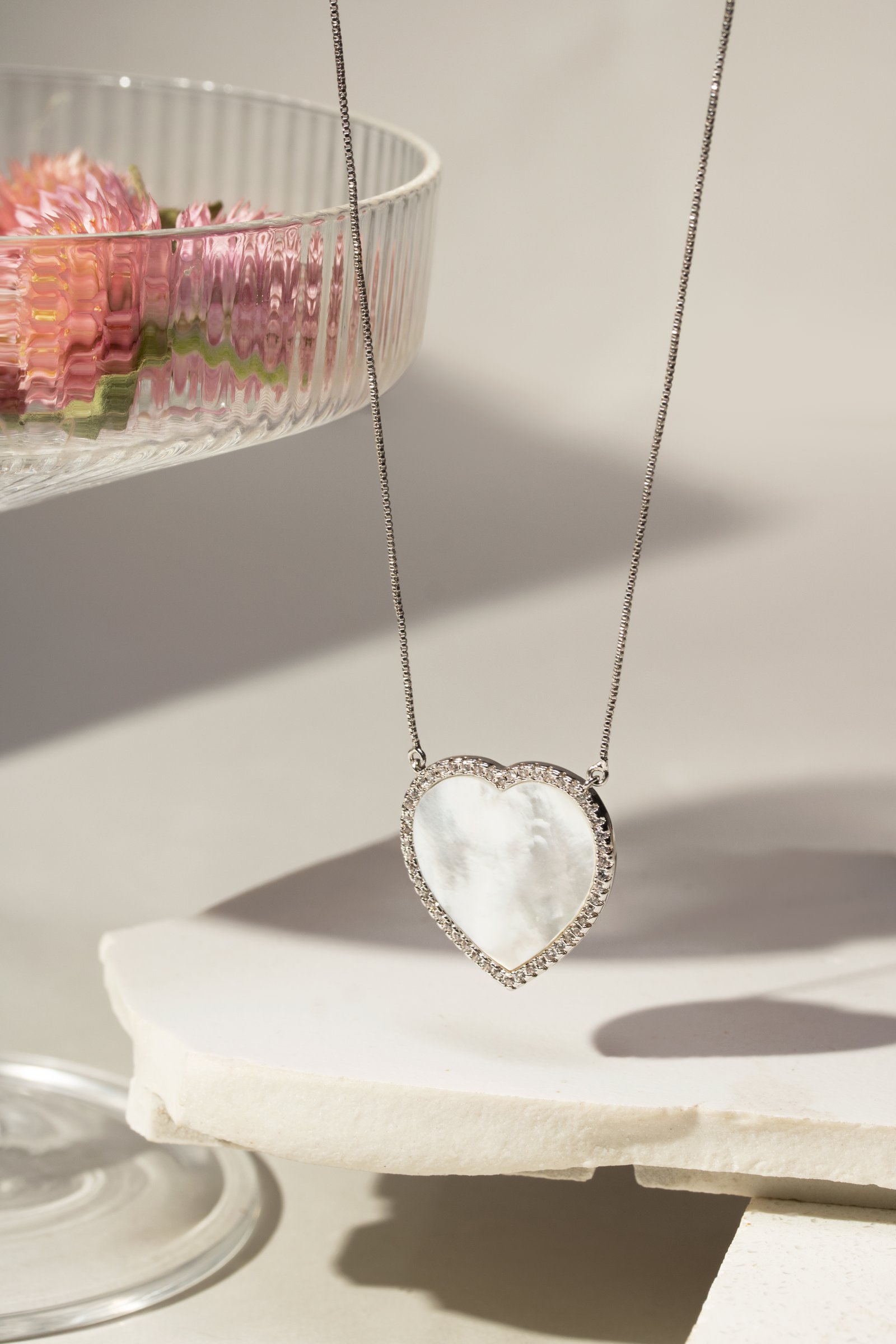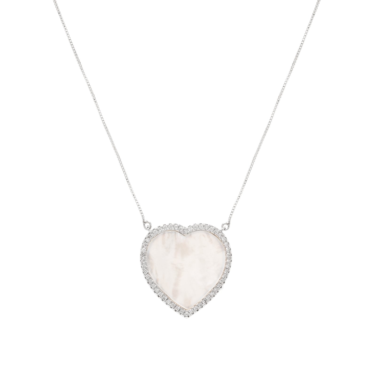 Colar Coração Madre Pérola Grande Banhado à Ródio Branco Cravejado com Zircônia Branca