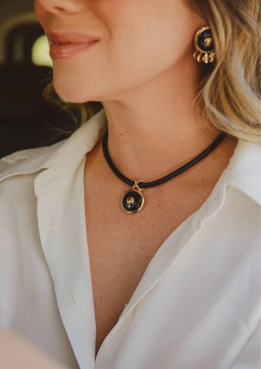 Colar de cordão preto com pingente em resina preto emoldurado no banho ouro 18K