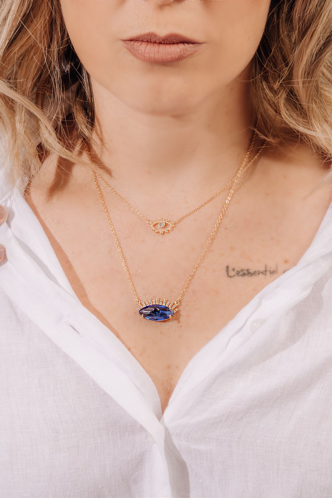 Colar Olho Grego Banhado à Ouro 18k com Pedra Azul e Cílios Cravejados com Zircônia Branca