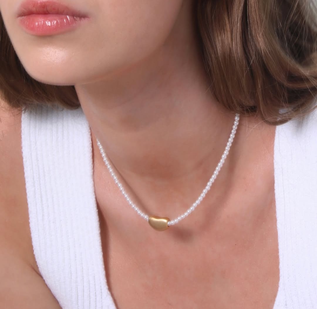 Colar Pérola Branca com detalhes Banhado à Ouro 18k Fosco