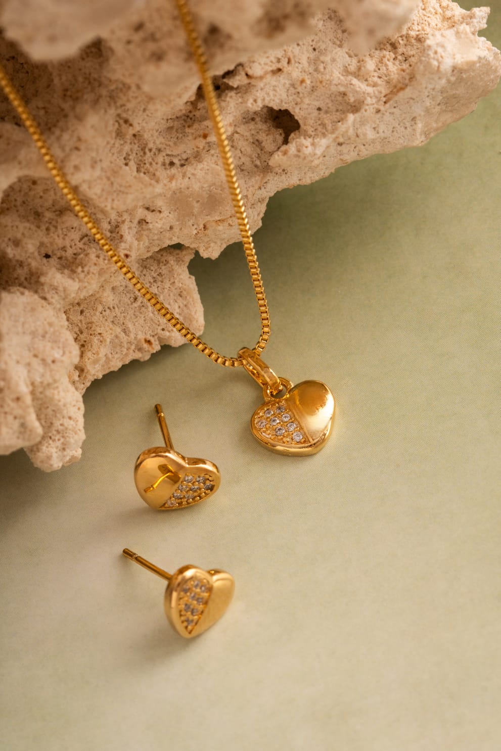 Conjunto Brinco e Corrente Banhado à Ouro 18k Coração Metade Cravejado com Zircônia