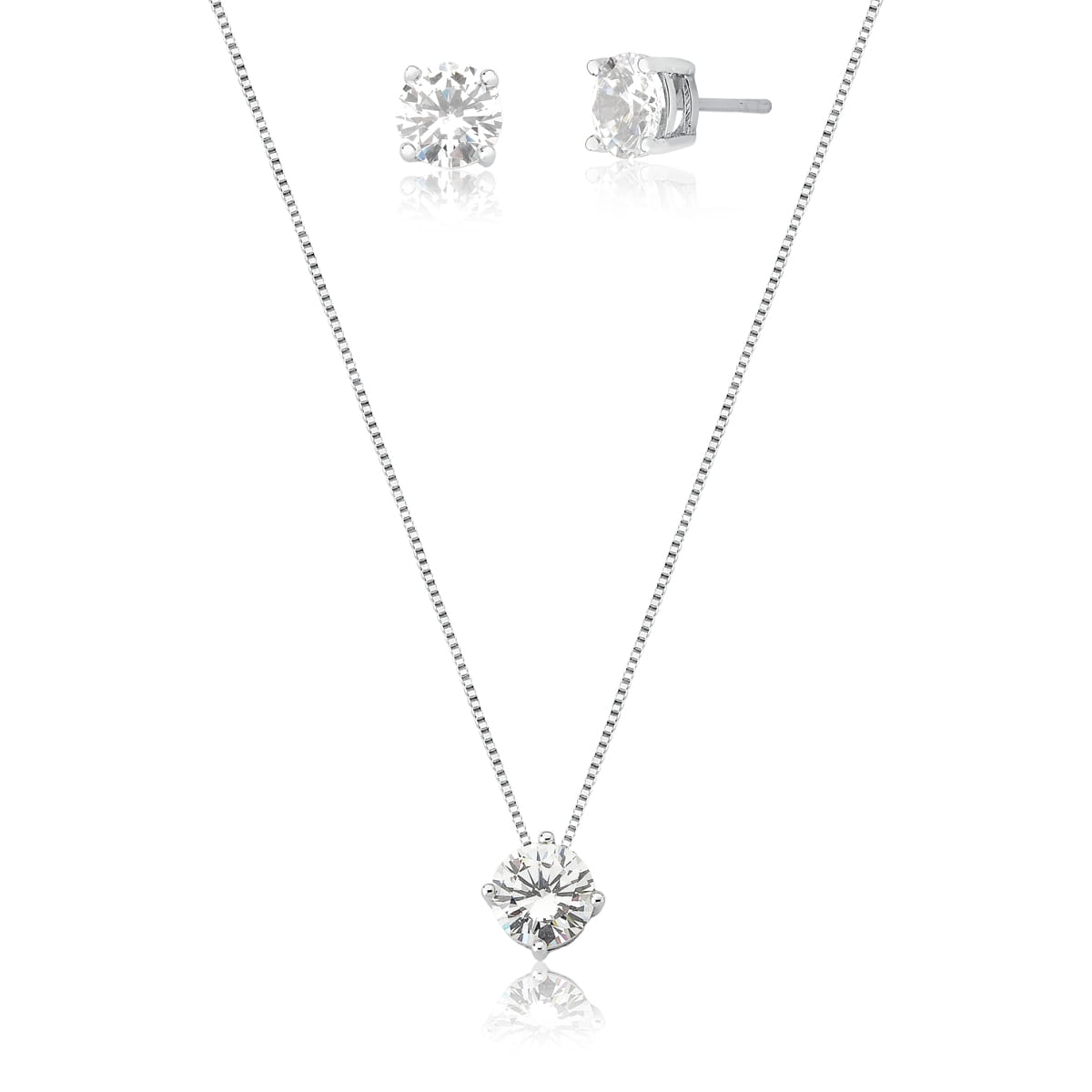 Conjunto Brinco e Corrente Banhado à Ródio Ponto de Luz 4 Garras com Pedra de Zircônia Grande