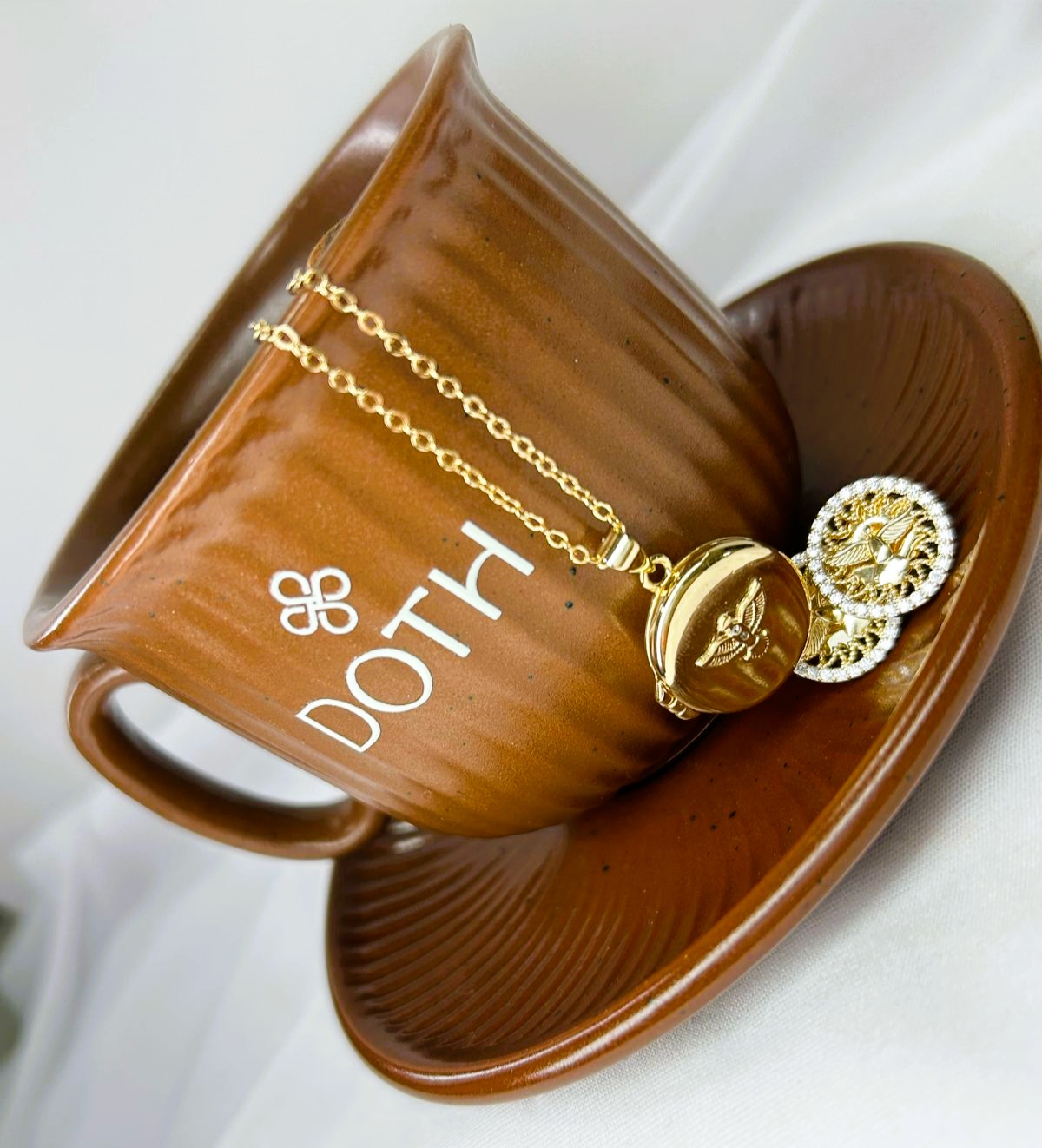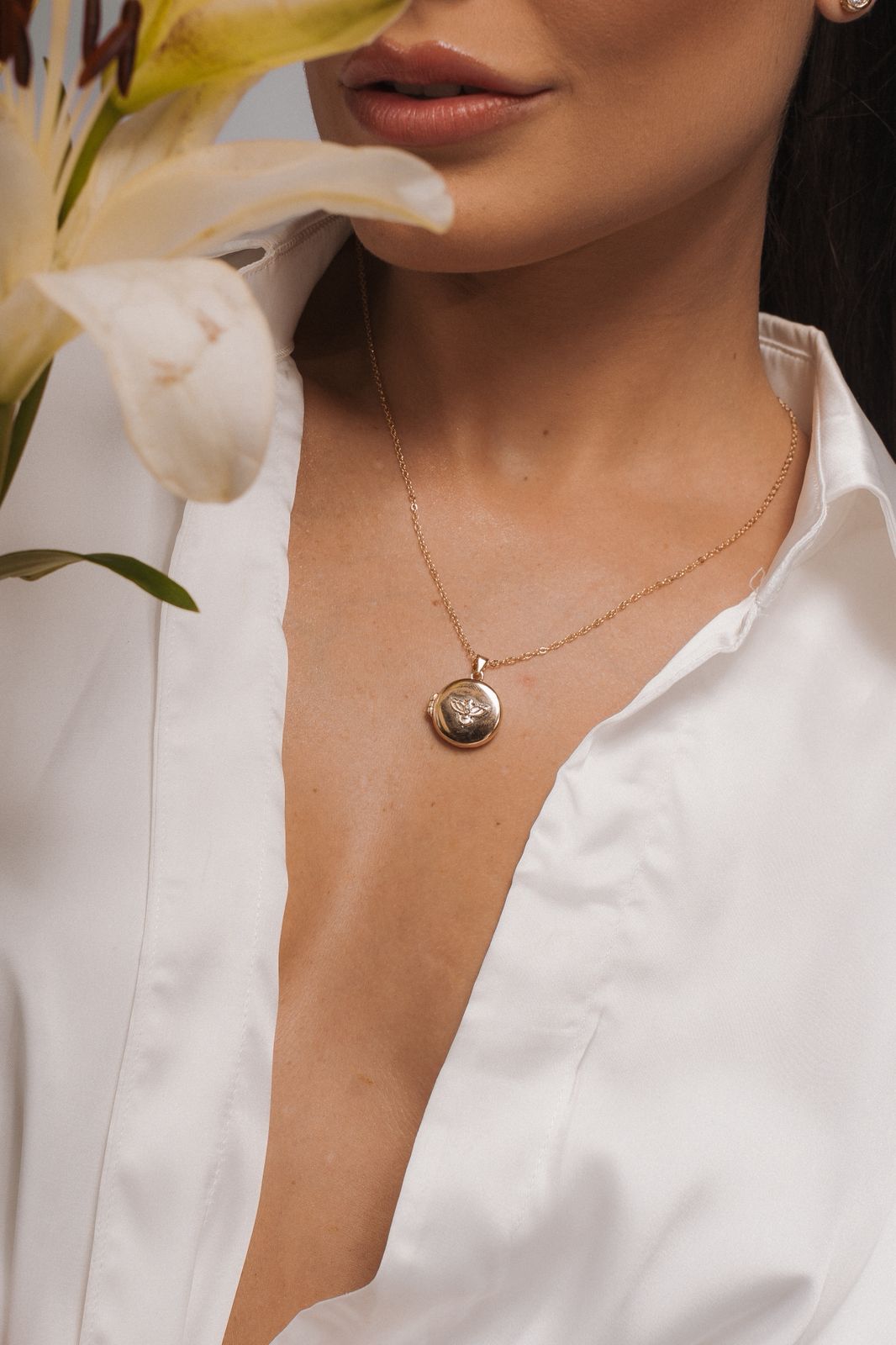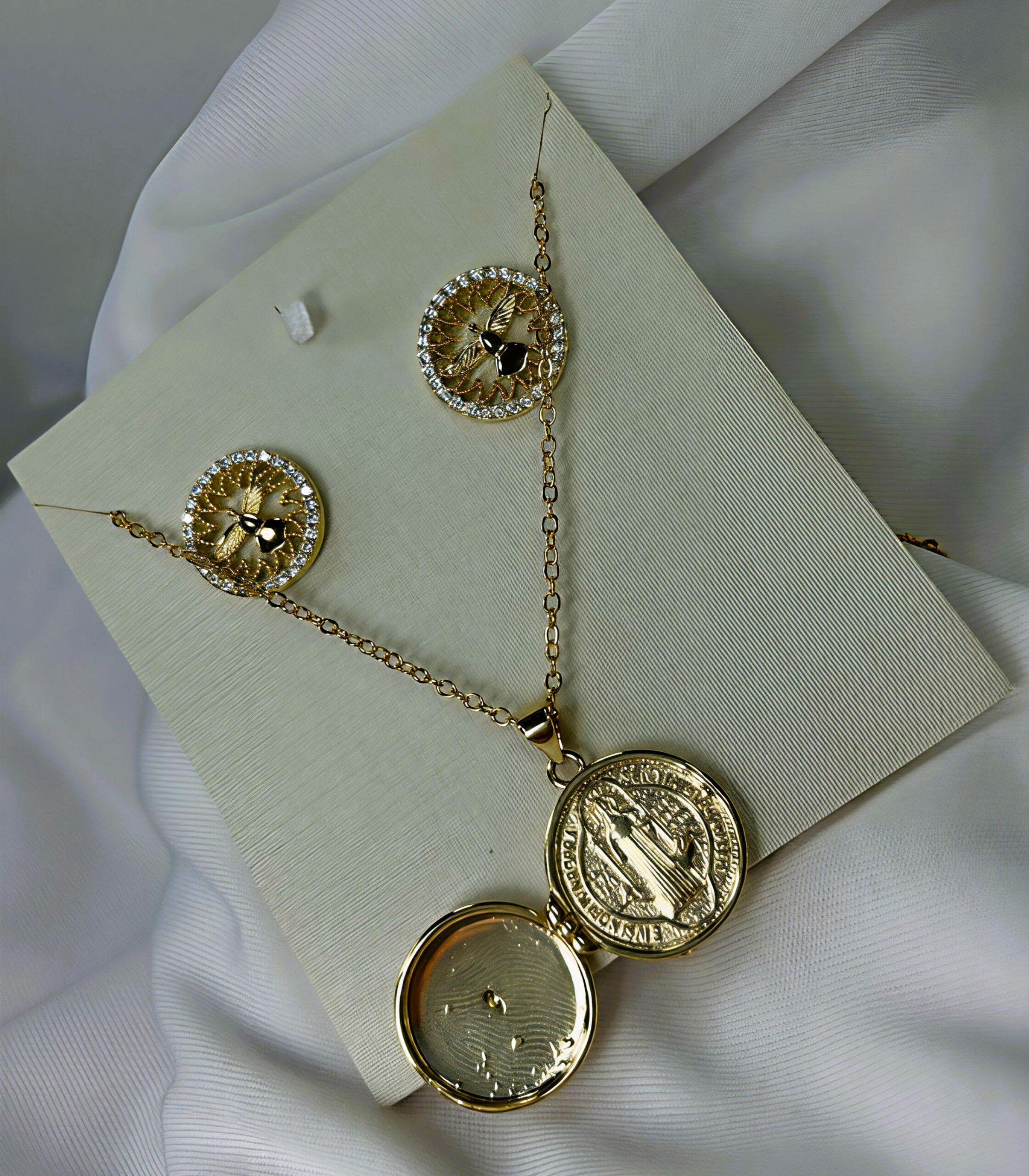 Conjunto Relicário Liso Espirito Santo Banhado à Ouro 18k