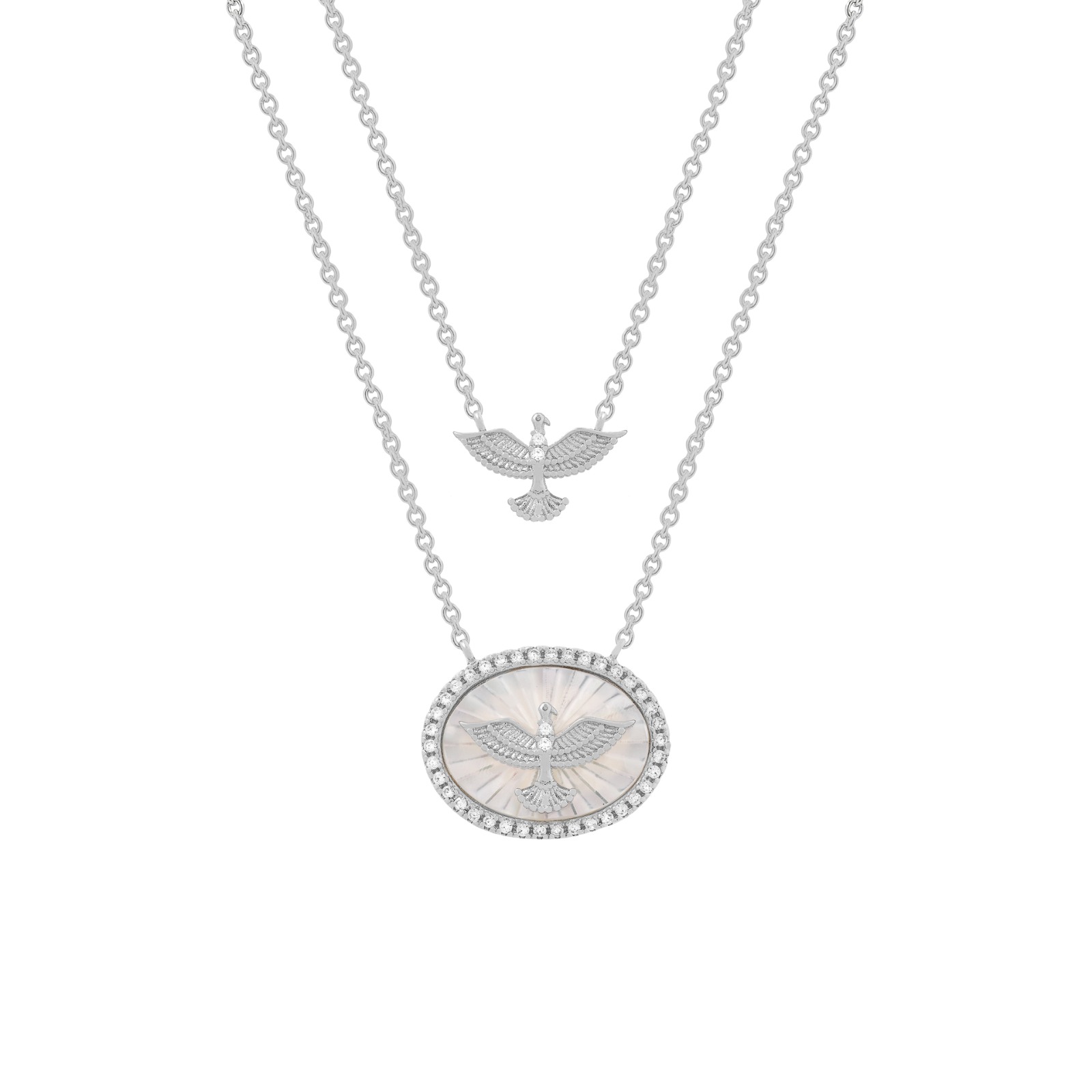 Escapulário Banhado à Ródio Elos com Pingentes Espírito Santo Liso e Cravejado Zircônia Branca