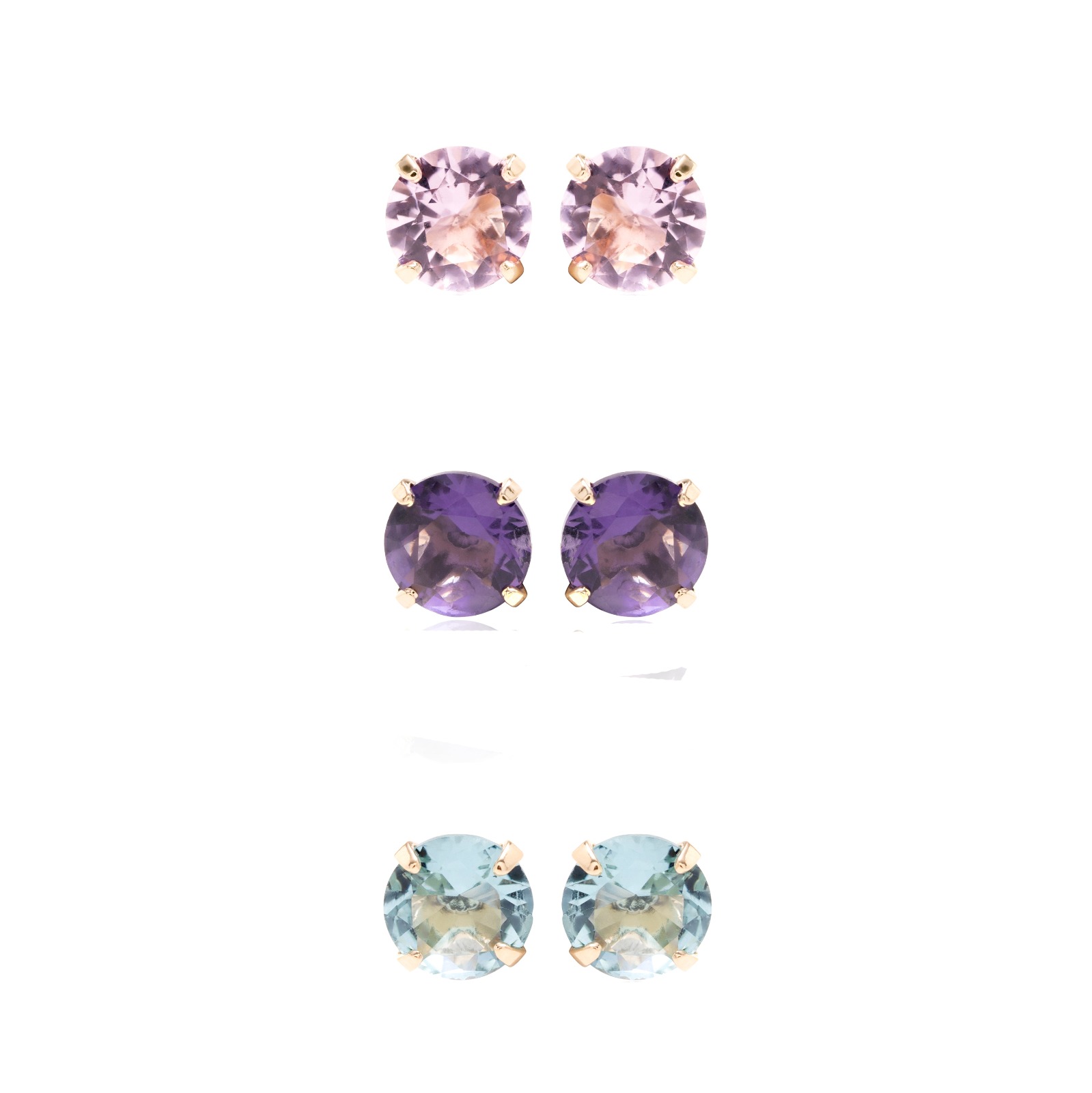 Kit com 3 Brincos Banhado à Ouro 18K Pingo de Luz Redondo Colorido Topázio Ametista Quartzo Rosa