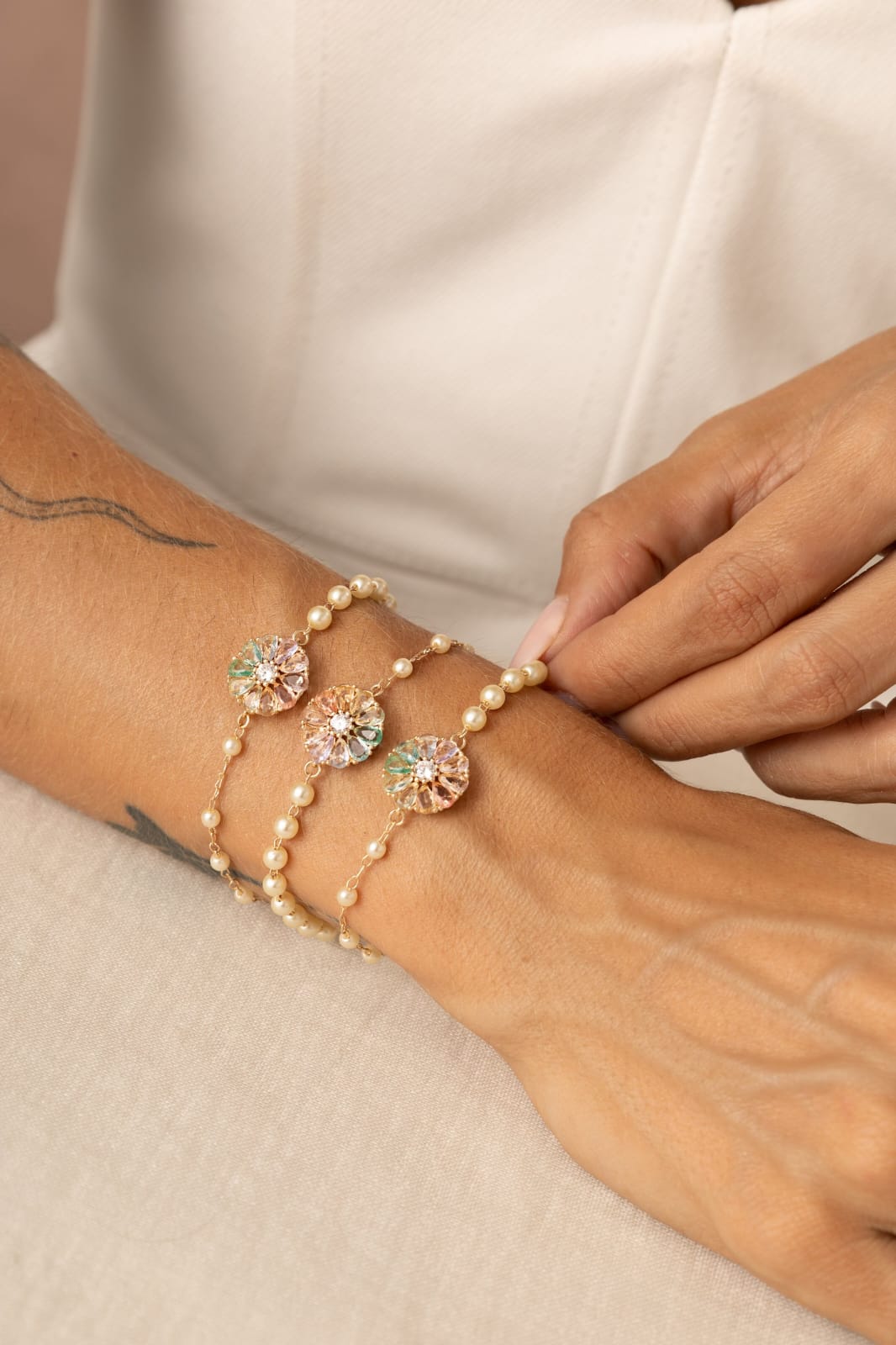 Pulseira Banhado à Ouro 18K Pérola Coreana com Pingente Flower Candy Cristal Morganita Colorida