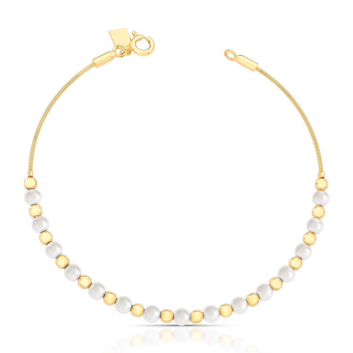 Pulseira Malha Trabalhada Banhado em Ouro 18K com Pérolas Intercaladas com Bolinhas Lisa